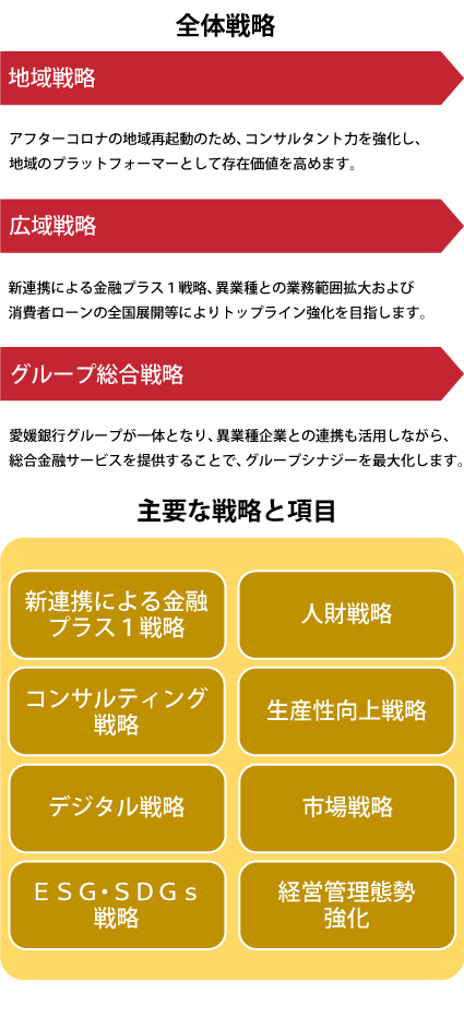 当行は、総資産約2.8兆円の規模を持ち、地盤としている愛媛県を中心に9都府県に店舗を擁し、東京証券取引所市場プライム市場に株式を上場している銀行です。グループ事業は銀行業務を中核に同業務に付随する業務及びリース業などを営んでいます。また、持分法適用非連結子会社において、ベンチャー企業等への投資業務を行っています。
